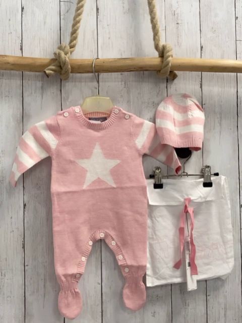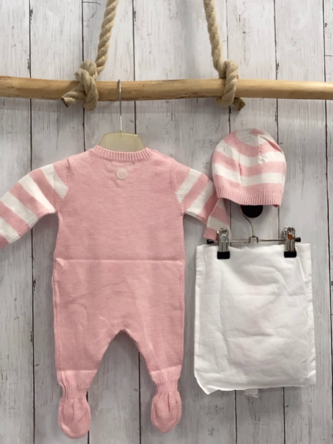 Boboli neu 3tlg Strampler + Mütze + Stoffbeutel Gr. 56 rosa weiß gestreift Stern Strick