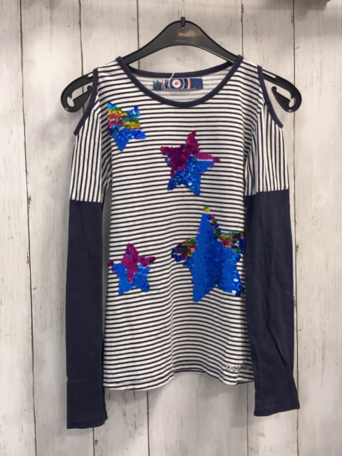 Desigual Langarmshirt Gr. 134/140 weiß schwarze Streifen blaue Ärmel Pailettensterne