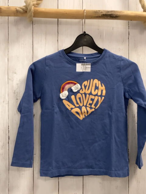 name it Langarmshirt Gr. 122/128 blau bunter Häkelregenbogen ocker glänzende Schrit