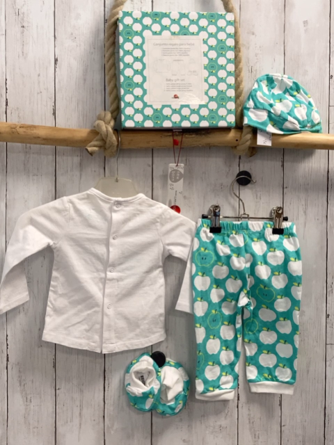 neu 4tlg Langarmshirt Leggings Mütze + Schühchen Gr. 68 türkis weiß Äpfel