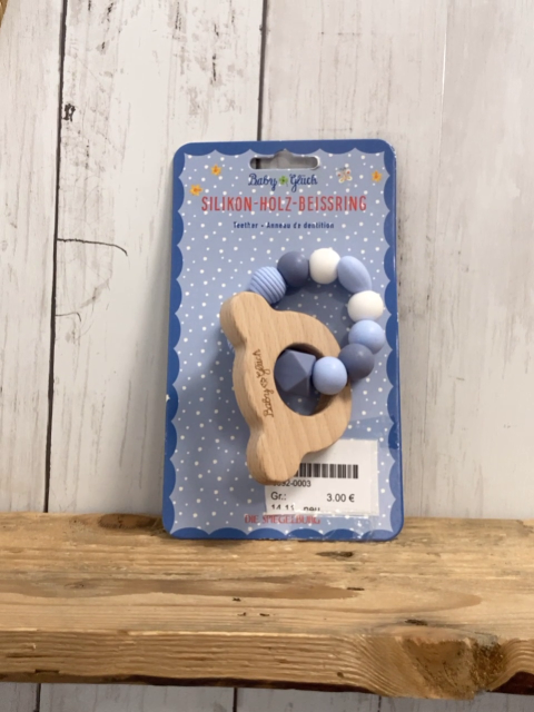 neu Holzspielzeug Silikon-Holz-Beissring Bärenkopf + hellblau blua weiße Perlen