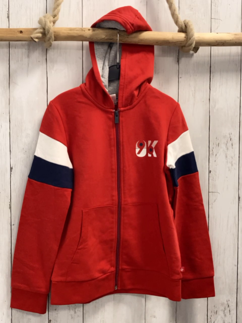 Okaidi Sweatjacke Gr. 140 rot Kapuze + blau weiße Streifen am Ärmel