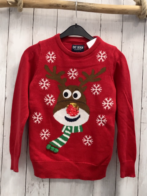 Pullover Gr. 128 rot Strick Elch mit Pailettennase weiße Schneekristalle