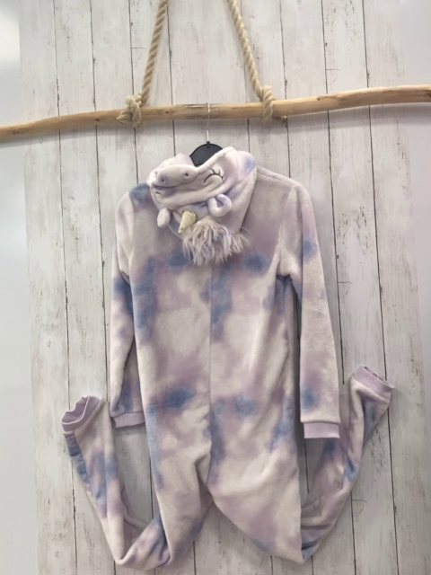 Vertbaudet Plüschoverall Gr. 152 weiß flieder hellblau gemustert Kapuze mit Einhorn